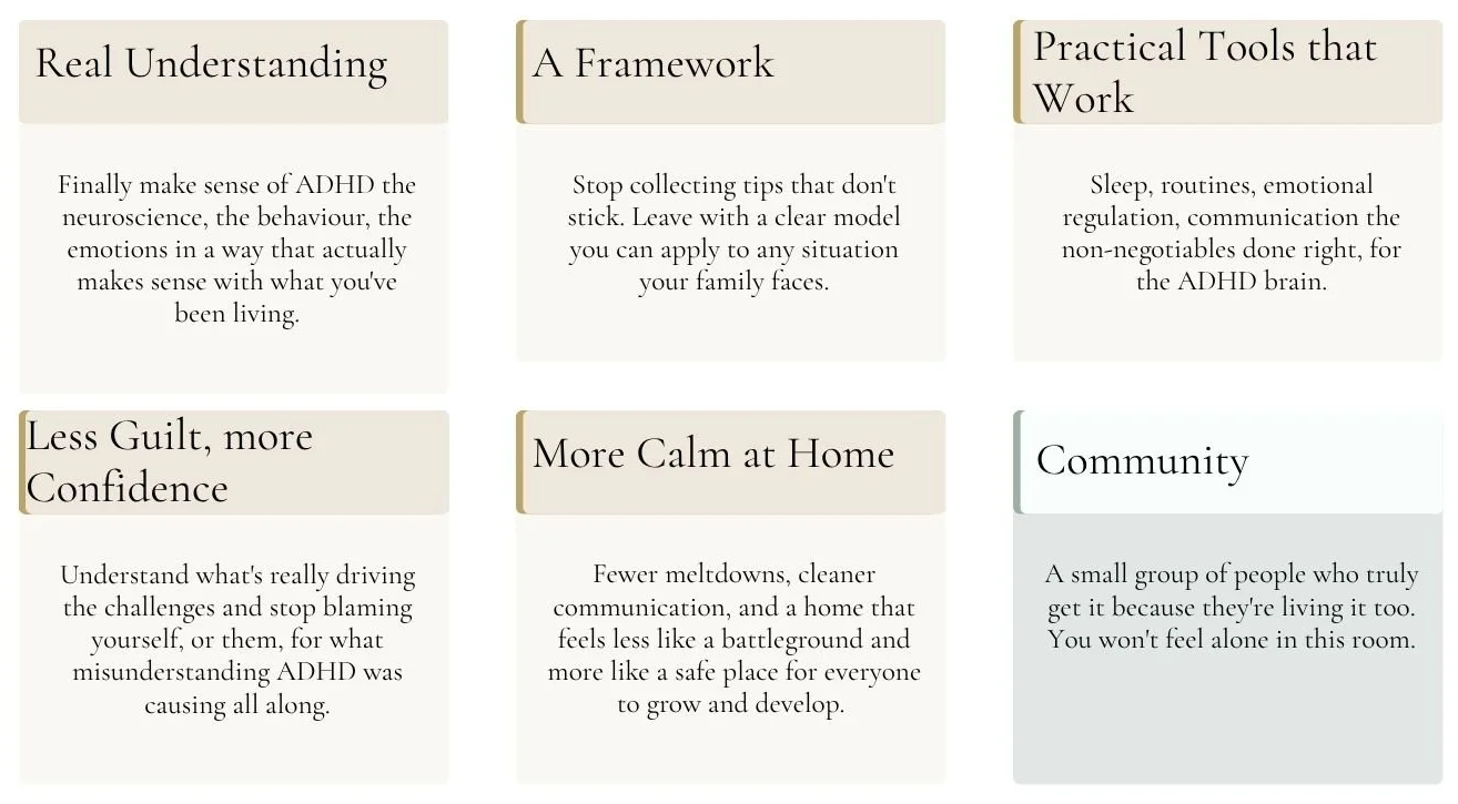 Many families feel overwhelmed, misunderstood, and stuck in the same exhausting cycles with ADHD and are looking for a step-by-step process to transform day-to-day life and the way the family functions.